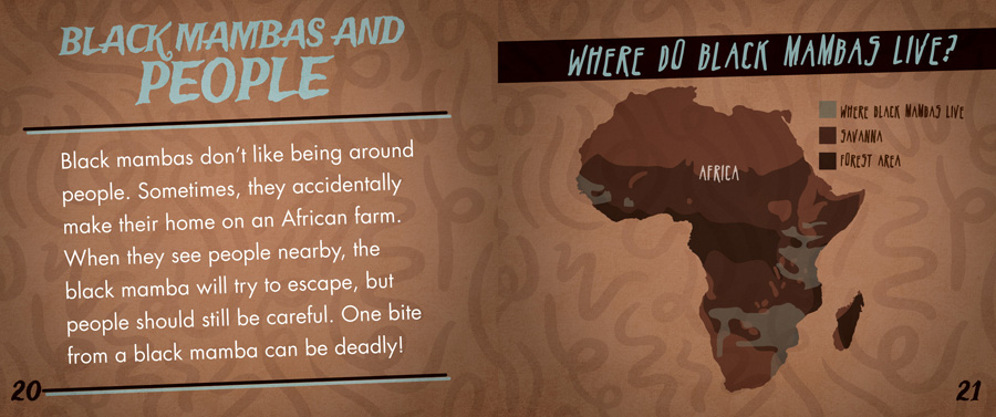 The black mamba is a deadly predator, but just what makes it so dangerous? From a set of hollow fangs specially designed to deliver venom to the mind-blowing speed of their strike, the black mamba will thrill and excite young snake lovers to learn more. Featuring brilliant photographs of what gives this snake its name, this book is perfect for every young reader ready to jump into the fascinating world of this dangerous snake.