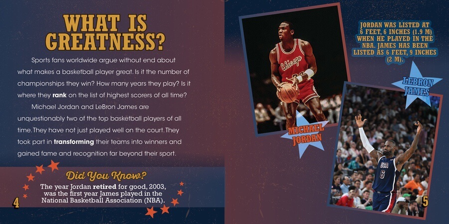 Michael Jordan has won six NBA championships. LeBron James has won four. But, LeBron is the number one highest scorer of all time in the NBA. Jordan is number five. What other ways can these two legendary athletes be compared? Readers are invited to try to decide whether James or Jordan really is the greatest basketball player of all time but considering championships, stats, minutes played, Olympic medals, and more. Full-color photographs from through these superstars' careers show readers what hard work and dedication can achieve!