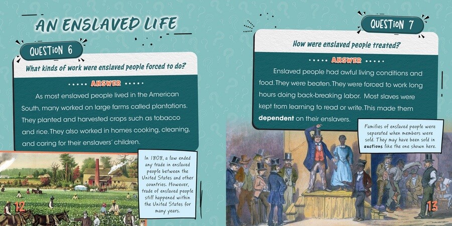 When did slavery start in North America? Why did it occur so long in the United States? And what happened once enslaved people were free? The reality of enslavement can be shocking to young learners. The terrible treatment these people received at the hands of enslavers—and the ripples of that long after—can be hard for modern audiences to truly understand. In this book, readers find the answers to their most pressing questions about enslavement, all written in straightforward, age-appropriate language for comprehension by readers of many levels. Historical images, maps, and graphic organizers complement the main text.